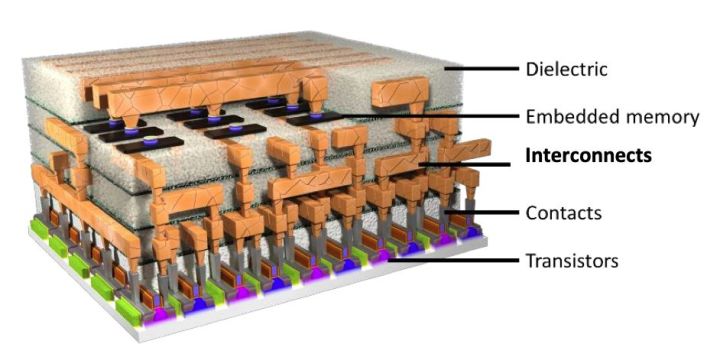 The following image is a beautiful schematic diagram, wherein the copper-colored layer represents copper. In reality, there can be up to 12 layers of metal in the chip, which are interconnected to form circuits by linking the bottommost transistors together.