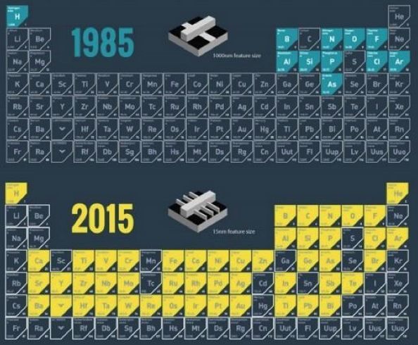 The following diagram effectively illustrates how humans exhaustively utilized the various possibilities on the periodic table of elements in the course of semiconductor development. This does not even include various compounds.